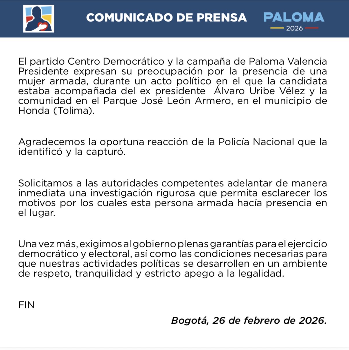 «El partido Centro Democratico y la campaña de Paloma Valencia Presidente expresan su preocupación por la presencia de una mujer armada durante un acto político en el que la candidata estaba acompañada del expresidente Álvaro Uribe Vélez», señaló el partido en un comunicado.