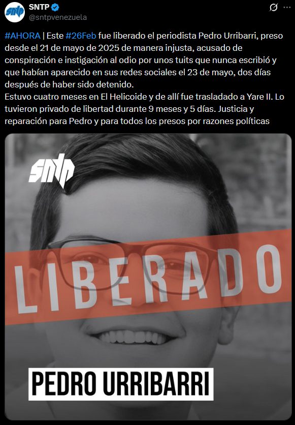 «Este 26 de febrero fue liberado el periodista Pedro Urribarri, preso desde el 21 de mayo de 2025 de manera injusta, acusado de conspiración e instigación al odio por unos tuits que nunca escribió y que habían aparecido en sus redes sociales el 23 de mayo, dos días después de haber sido detenido», aclaró el Sntp en una publicación.