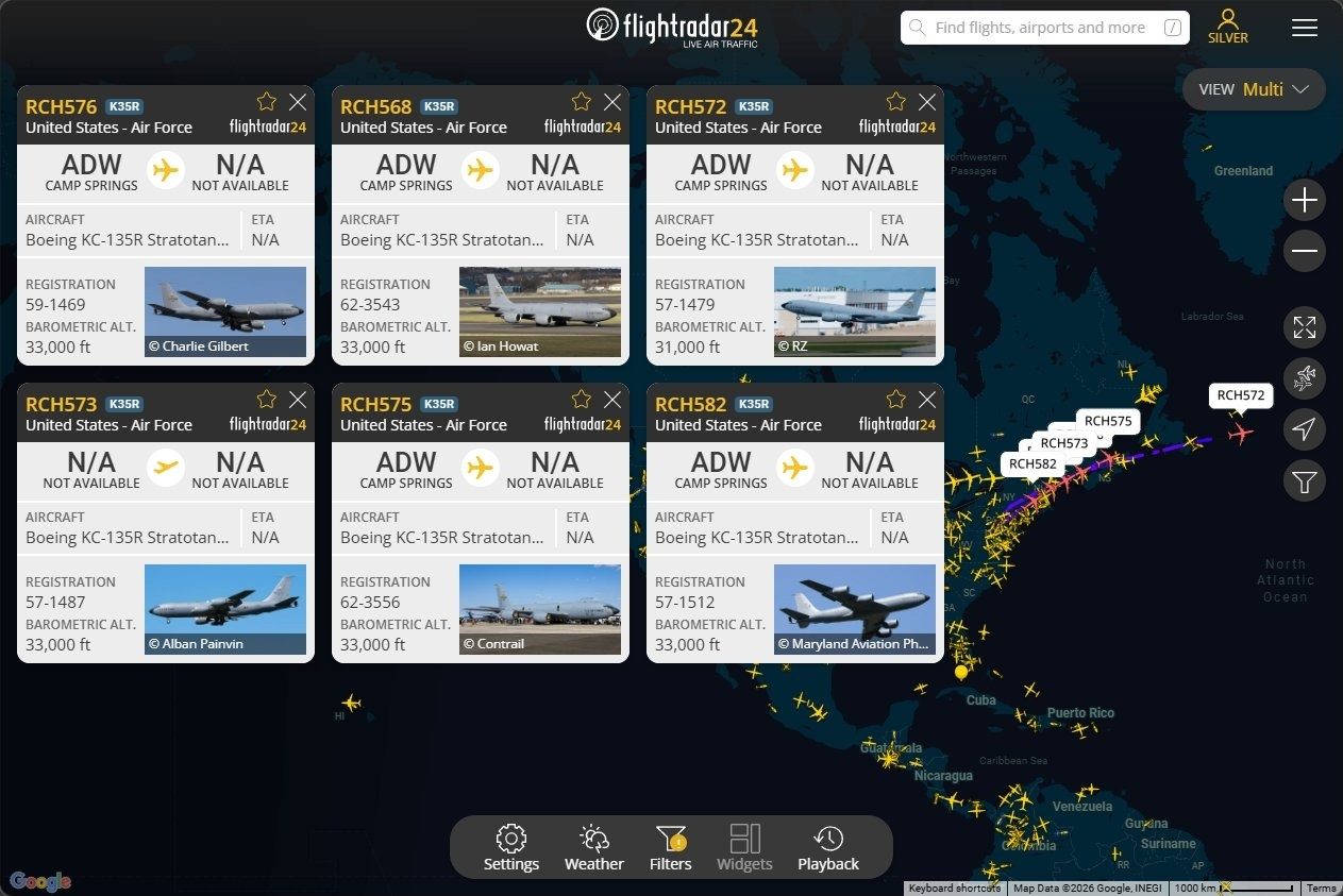Los reportes técnicos identificaron que el grueso de la flota corresponde al modelo KC-135R Stratotanker (código de llamada K35R). Estas aeronaves cumplen la función crítica de reabastecimiento en vuelo, permitiendo que los aviones de combate y bombarderos mantengan operaciones prolongadas sin necesidad de aterrizar en zonas de conflicto. La magnitud del desplazamiento logístico coincidió con la presencia de decenas de bombarderos estratégicos B-52 en las mismas bases aéreas de origen.