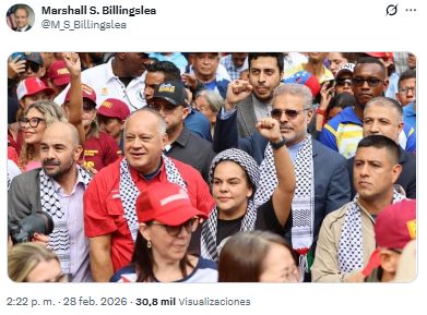 La imagen, captada durante una movilización chavista en Caracas fue utilizada por Billingslea para recordar la estrecha relación que mantiene la cúpula del chavismo con el régimen de Teherán.