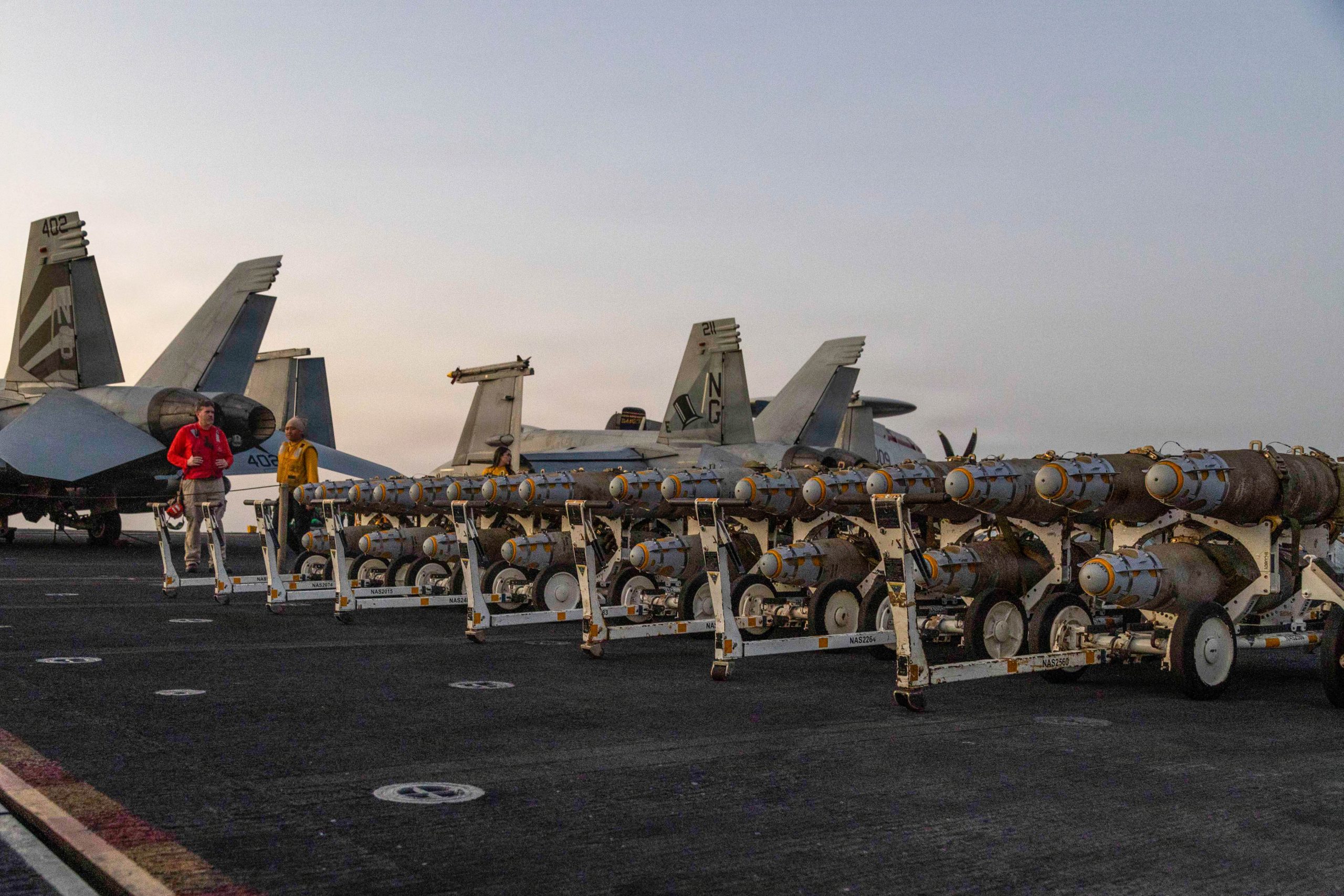 Marineros estadounidenses se preparan para cargar municiones en un F/A-18F Super Hornet, asignado al Escuadrón de Cazas de Ataque (VFA) 41, en la cubierta de vuelo del portaaviones USS Abraham Lincoln (CVN 72) de clase Nimitz, en apoyo de la Operación Furia Épica, el 28 de febrero de 2026. (Foto de la Marina de los EE. UU.)