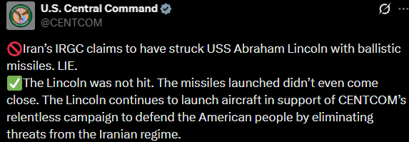 «La Guardia Revolucionaria Islámica de Irán afirma haber atacado el USS Abraham Lincoln con misiles balísticos. MENTIRA», expresó el Centcom en su cuenta de redes sociales.