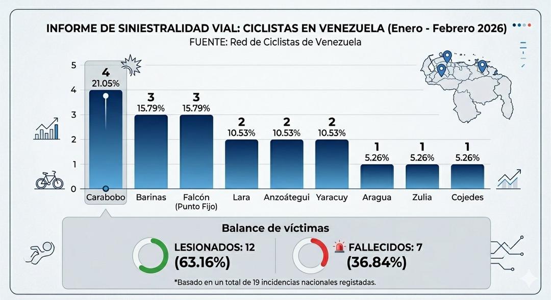 Russel Camero, coordinadora general de la red en la región, informó que entre enero y febrero se registraron 19 incidencias en el territorio nacional: cuatro de ellas en Carabobo, lo que representa el 21,05% de las eventualidades viales contra ciclistas. En la lista siguen Falcón y Barinas, con tres accidentes cada uno (15,79% por entidad); Lara, Anzoátegui y Yaracuy, con dos por estado; y Aragua, Cojedes y Zulia con un registro cada uno.