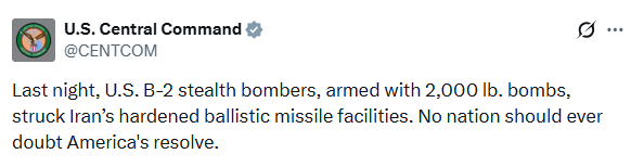 Según el funcionario, cuatro bombarderos B-2 volaron ida y vuelta desde Estados Unidos y “arrojaron docenas de bombas de 2000 libras sobre sitios subterráneos de misiles balísticos en Irán”.