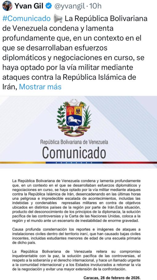 El comunicado chavista, que ni siquiera se atrevía a nombrar a EEUU e Israel, ni a sus gobernantes, aseguraba que «Venezuela condena y lamenta profundamente que, en un contexto en el que se desarrollaban esfuerzos diplomáticos y negociaciones en curso, se haya optado por la vía militar en contra de la República Islámica de Irán».