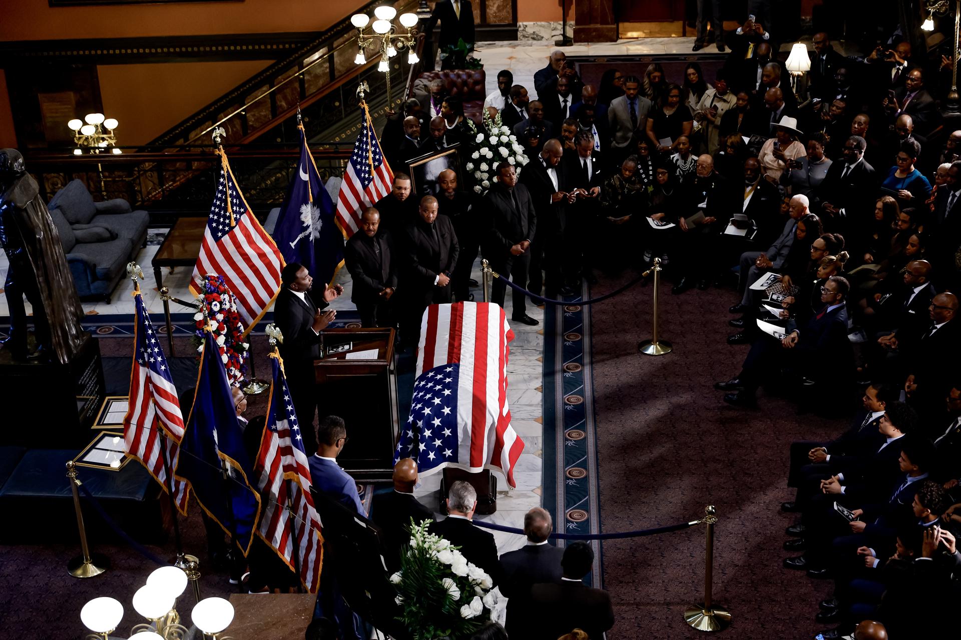 El público asiste a un servicio conmemorativo en memoria del difunto reverendo Jesse Jackson Sr. en la rotonda del Capitolio Estatal de Carolina del Sur en Columbia, Carolina del Sur, EE. UU., el 2 de marzo de 2026. El líder estadounidense de los derechos civiles y originario de Carolina del Sur será velado públicamente. Los servicios conmemorativos en memoria de Jackson, quien falleció el 17 de febrero de 2026 a los 84 años, se están celebrando en Chicago y Carolina del Sur. EFE/EPA/ERIK S. LESSER