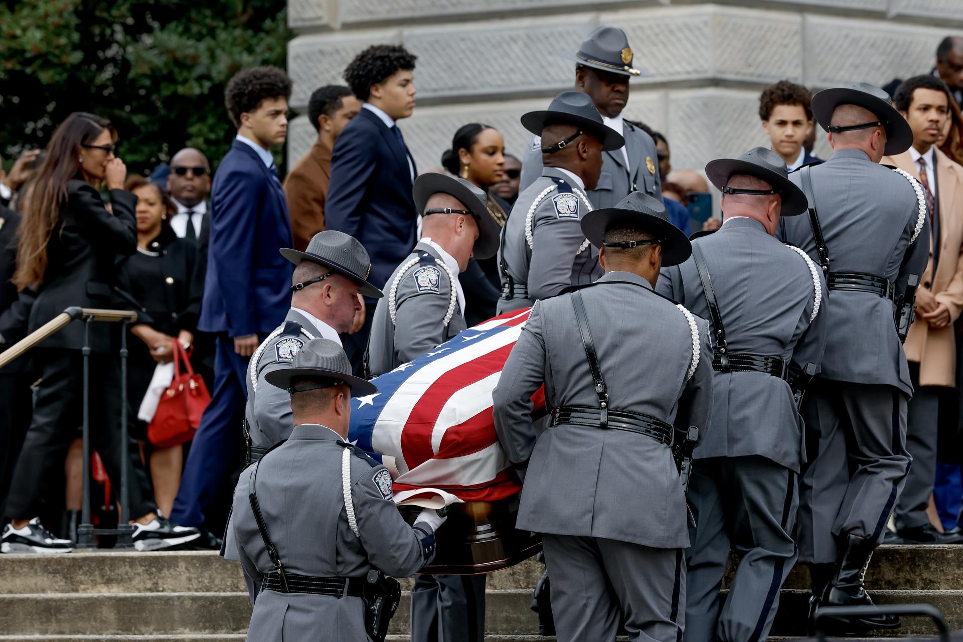 Una guardia de honor de la Patrulla Estatal de Carolina del Sur traslada el cuerpo del reverendo Jesse Jackson Sr. desde el Capitolio de Carolina del Sur para su velatorio en Columbia, Carolina del Sur, EE. UU., el 2 de marzo de 2026. Se celebró una ceremonia privada antes del velorio público para el líder estadounidense de los derechos civiles y originario de Carolina del Sur. Los servicios funerarios en memoria de Jackson, quien falleció el 17 de febrero de 2026 a los 84 años, se están llevando a cabo en Chicago y Carolina del Sur. EFE/EPA/ERIK S. LESSER