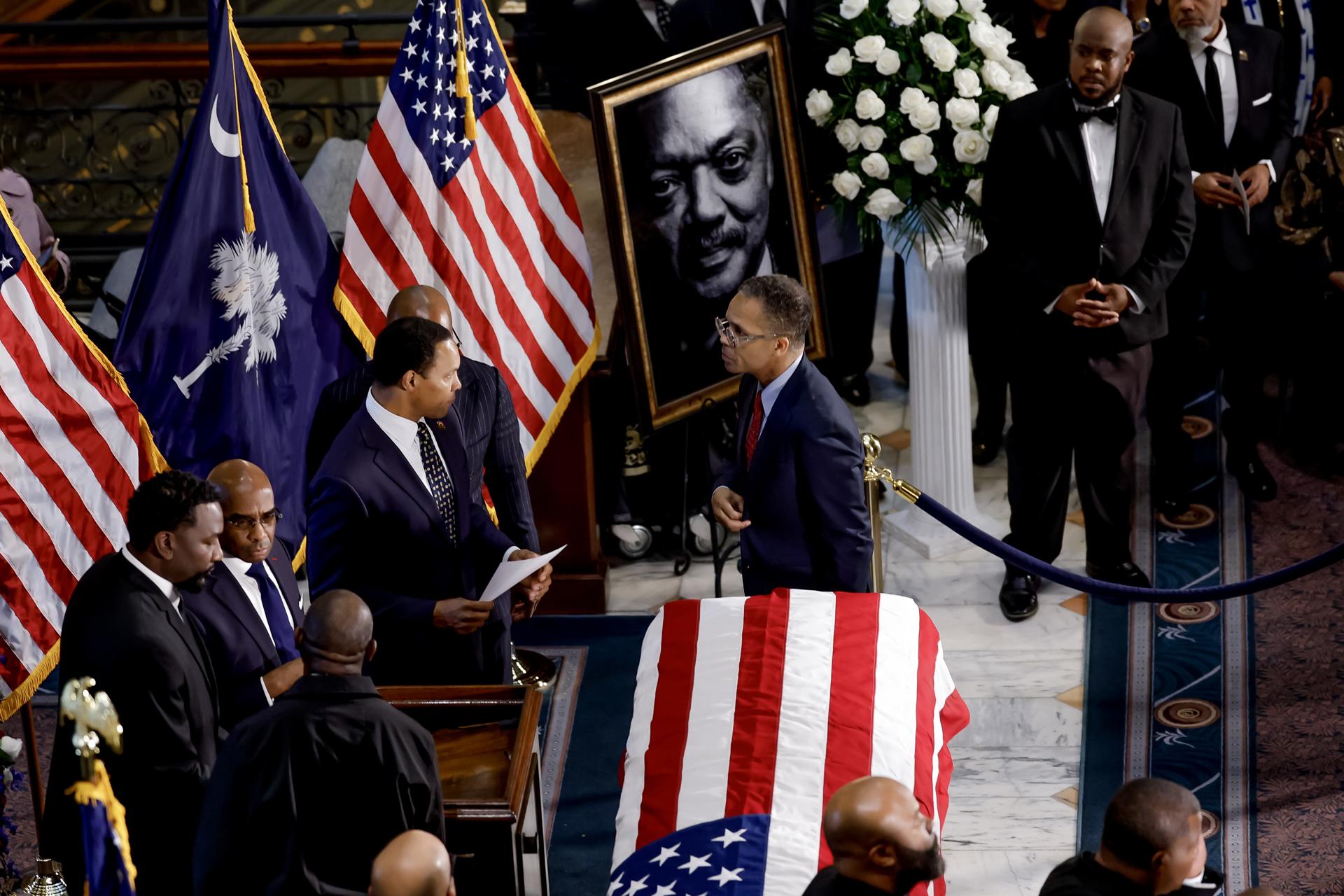 Jesse Jackson Jr. (C) participa en un servicio conmemorativo en honor a su padre, el difunto reverendo Jesse Jackson Sr., en la rotonda del Capitolio Estatal de Carolina del Sur en Columbia, Carolina del Sur, EE. UU., el 2 de marzo de 2026. El líder estadounidense de los derechos civiles y originario de Carolina del Sur será velado públicamente. Los servicios conmemorativos de Jackson, quien falleció el 17 de febrero de 2026 a los 84 años, se están celebrando en Chicago y Carolina del Sur. EFE/EPA/ERIK S. LESSER