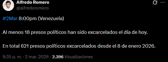 En su publicación, el abogado y activista detalló el registro acumulado de casos verificados. «En total 621 presos políticos excarcelados desde el 8 de enero 2026», apuntó.