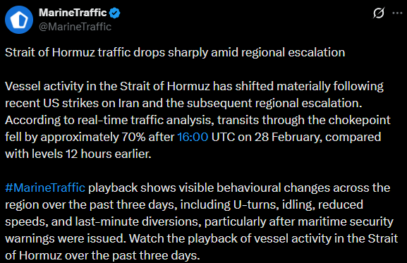 «La actividad marítima en el Estrecho de Ormuz ha experimentado un cambio sustancial tras los recientes ataques estadounidenses contra Irán y la consiguiente escalada regional. Según el análisis del tráfico en tiempo real, el tránsito por el cuello de botella se redujo aproximadamente un 70 % después de las 16:00 UTC del 28 de febrero, en comparación con los niveles de 12 horas antes», detalló MarineTraffic en una publicación de X.