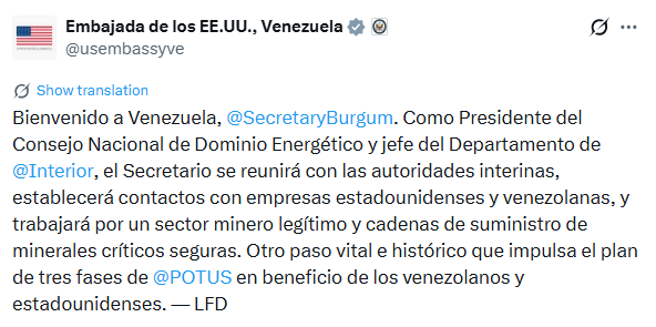 El Secretario de Interior de Estados Unidos, Doug Burgum, arribó a Venezuela este miércoles 4 de marzo como parte de una visita estratégica para fortalecer la cooperación energética y minera.