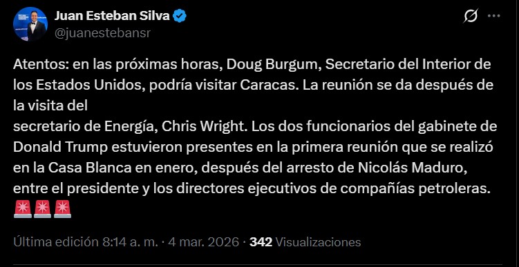Atentos: en las próximas horas, Doug Burgum, Secretario del Interior de los Estados Unidos, podría visitar Caracas. La reunión se da después de la visita del secretario de Energía, Chris Wright. Los dos funcionarios del gabinete de Donald Trump estuvieron presentes en la primera reunión que se realizó en la Casa Blanca en enero, después del arresto de Nicolás Maduro, entre el presidente y los directores ejecutivos de compañías petroleras”, indicó el periodista.