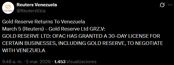 La Oficina de Control de Activos Extranjeros (Ofac), adscrita al Departamento del Tesoro de Estados Unidos, otorgó esta semana una licencia de 30 días a ciertas empresas, incluida la minera canadiense Gold Reserve, para negociar con Venezuela, según aseguró la agencia Reuters en redes sociales.