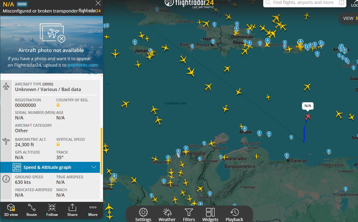 La plataforma FlightRadar24 lanzó un aviso automático de «Misconfigured or broken transponder» (transpondedor mal configurado o roto).