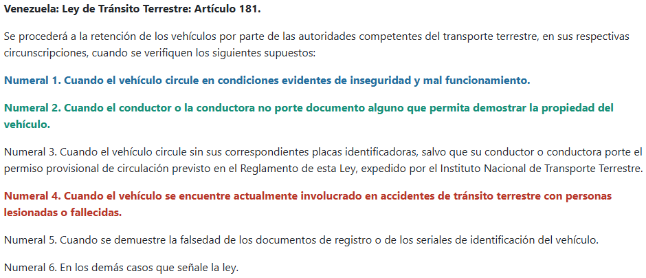 De acuerdo con el artículo 181 de la Ley de Transporte Terrestre, las autoridades pueden retener un vehículo únicamente en casos específicos, como cuando circula en condiciones de inseguridad, cuando el conductor no porta documentos que acrediten la propiedad o cuando se verifiquen infracciones que comprometan la seguridad vial.