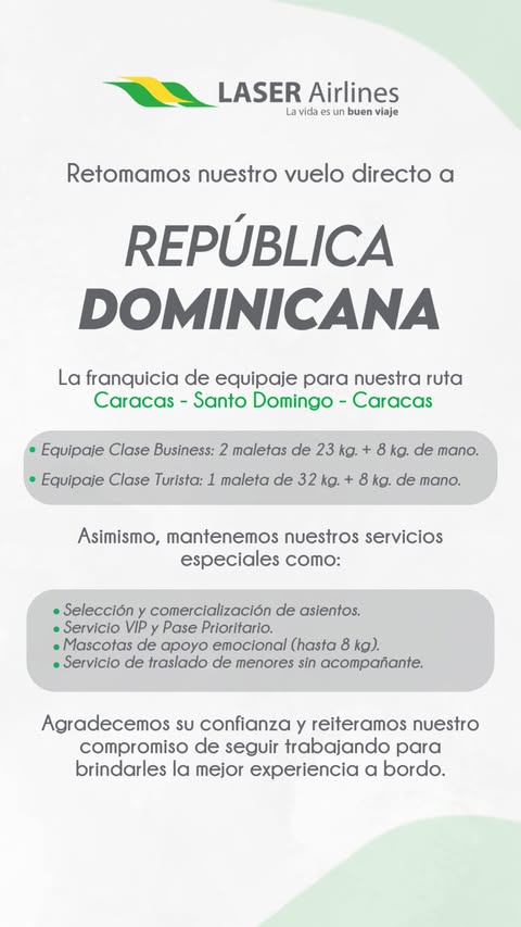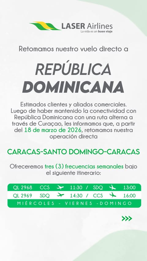 La aerolínea venezolana Laser Airlines anunció la reanudación de sus vuelos directos entre Caracas y la ciudad de Santo Domingo en República Dominicana. La compañía aérea fijó el inicio de estas operaciones comerciales para el 18 de marzo, con el propósito de conectar ambos destinos sin escalas.