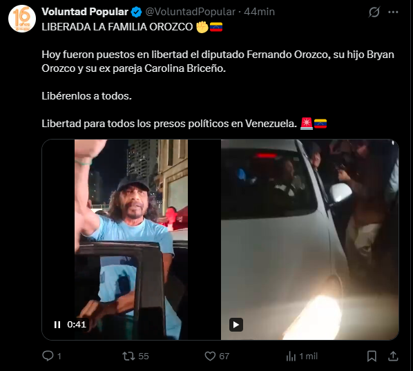 Las imágenes difundidas muestran la salida del exdiputado Fernando Orozco y su hijo Bayant Orozco, quienes fueron liberados acompañados de la señora Dilia Castillo, madre de Yessy y Bayant, delante de familiares y simpatizantes emocionados.