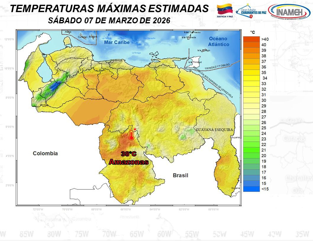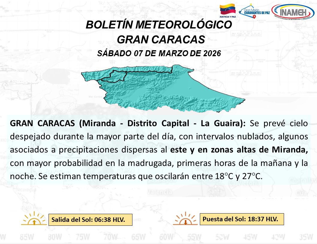 No obstante, durante las primeras horas del día se estiman mantos nubosos en zonas de Anzoátegui, Monagas, Delta Amacuro, sur de la Guayana Esequiba, Bolívar, Amazonas, los Andes y Zulia, que podrían generar algunas lluvias aisladas.