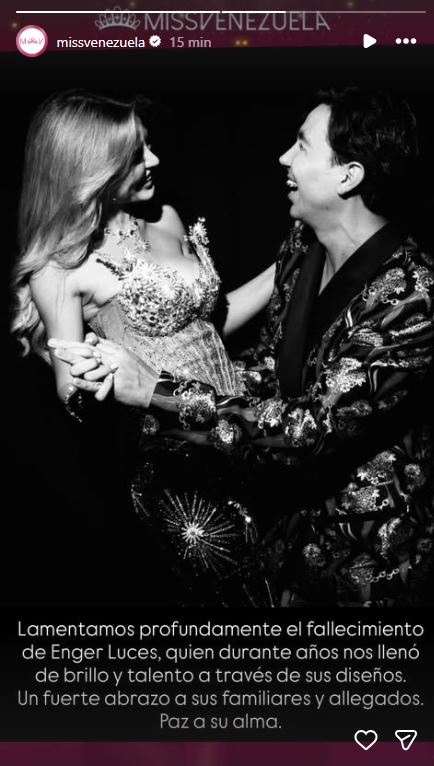 “Lamentamos profundamente el fallecimiento de Enger Luces, quien durante años nos llenó de brillo y talento a través de sus diseños. Un fuerte abrazo a sus familiares y allegados. Paz a su alma”, escribió la organización en la historia compartida en la red social.