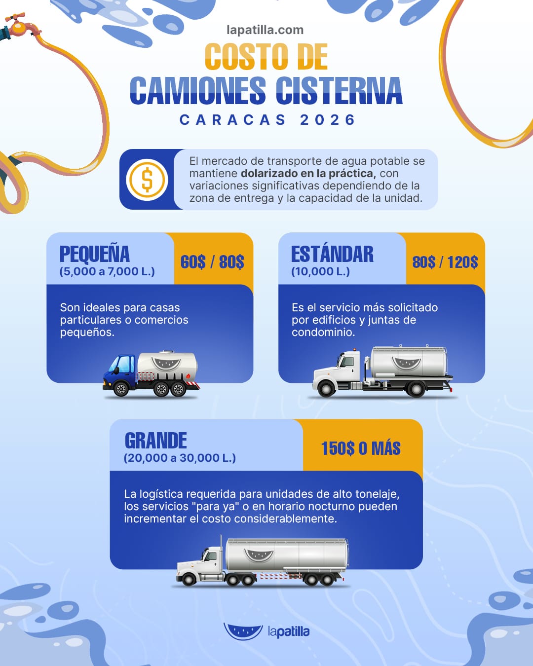 El mercado de transporte de agua potable se mantiene dolarizado en la práctica, con variaciones significativas dependiendo de la zona de entrega y la capacidad de la unidad.