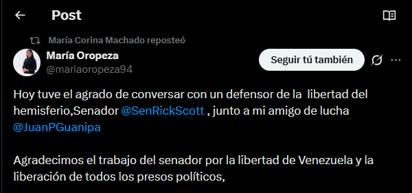 “Hoy tuve el agrado de conversar con un defensor de la libertad del hemisferio, senador Rick Scott, junto a mi amigo de lucha Juan Pablo Guanipa”, expresó.