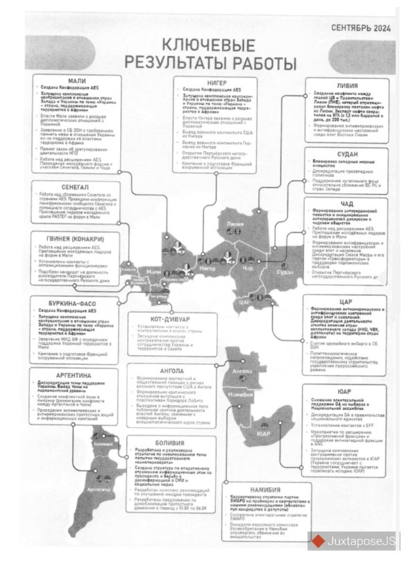 El mismo modelo se trasladó al Sahel -una importante región geográfica al sur del Sahara– con la creación de la Alianza de Estados del Sahel (AES) en septiembre de 2023, formada por Malí, Burkina Faso y Níger, estados que atravesaron golpes militares acompañados de retórica antioccidental. Según los archivos, “La Compañía” afirma haber sido determinante en la génesis de esta alianza y anticipa la expansión de una “coalición antioccidental más grande de África” desde 2024 en adelante. Las acciones incluyeron bloqueo de medios europeos, expulsión de ONG y rescisión de convenios de cooperación técnico-militar con Occidente.
