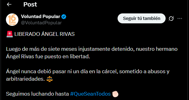 “Liberado Ángel Rivas. Luego de más de siete meses injustamente detenido, nuestro hermano Ángel Rivas fue puesto en libertad”, indicó el partido en su publicación.