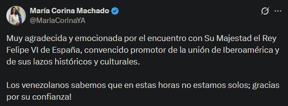 “Muy agradecida y emocionada por el encuentro con Su Majestad el Rey Felipe VI de España, convencido promotor de la unión de Iberoamérica y de sus lazos históricos y culturales”, escribió. En el mismo mensaje, añadió que los venezolanos saben que “en estas horas no están solos” y agradeció al monarca “por su confianza”.