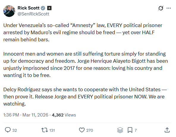 El senador estadounidense Rick Scott exigió este miércoles 11 de marzo a la administración de Delcy Rodríguez la liberación inmediata de todos los ciudadanos detenidos por motivos políticos en Venezuela.