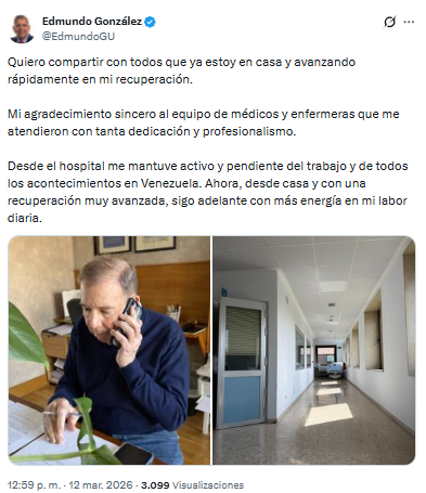 El presidente electo de Venezuela, Edmundo González, informó en X que ya se encuentra en su hogar tras haber superado satisfactoriamente una reciente etapa de cuidados médicos.