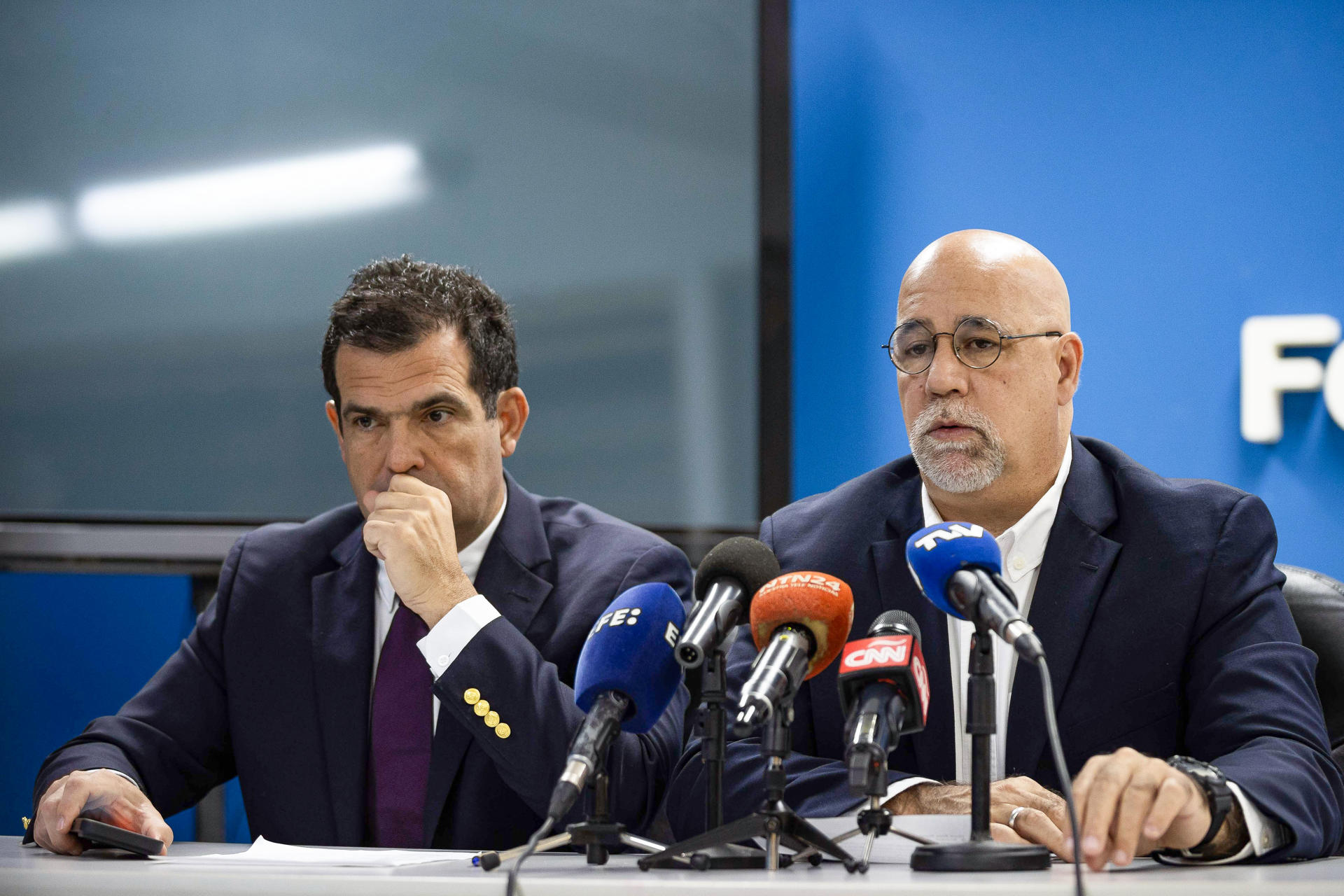 El director y vicepresidente de Foro Penal, Gonzalo Himiob (d), habla junto al director y presidente la ONG Foro Penal, Alfredo Romero, este jueves durante una rueda de prensa en Caracas (Venezuela). EFE/ Ronald Peña R