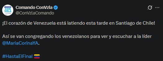 “¡El corazón de Venezuela está latiendo esta tarde en Santiago de Chile!”, escribió el Comando ConVzla en su cuenta de X, acompañado de imágenes de la multitud.