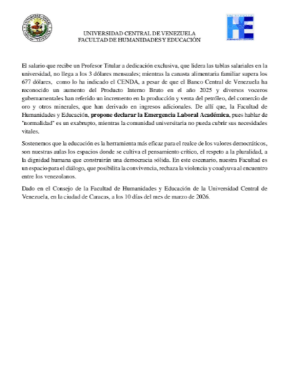 El Consejo de la Facultad de Humanidades y Educación de la Universidad Central de Venezuela (UCV) emitió un comunicado para declarar la «Emergencia Laboral Académica».