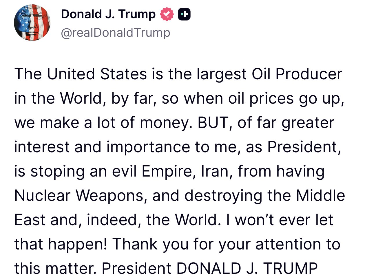 «PERO hay algo mucho más importante para mí, como presidente: impedir que un imperio malvado, Irán, tenga armas nucleares y destruya Oriente Medio y, de hecho, el mundo. ¡Nunca permitiré que eso ocurra!», advirtió el magnate neoyorquino.