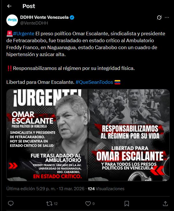 El Comité de Derechos Humanos del partido opositor Vente Venezuela denunció la tarde de este viernes 13 de marzo que el preso político Omar Escalante fue trasladado de emergencia a un centro de salud en el estado Carabobo tras presentar complicaciones médicas.