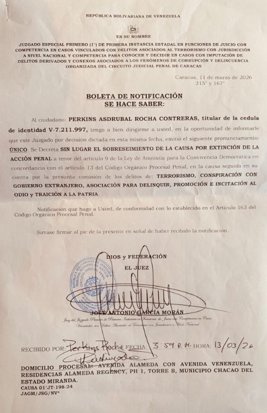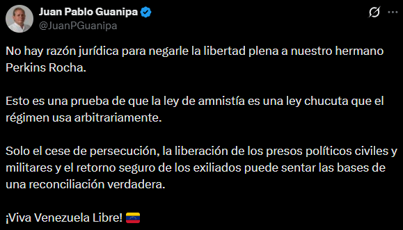El líder opositor venezolano Juan Pablo Guanipa criticó este sábado que el juez José Antonio García Morán decidiera bloquear la solicitud de amnistía del abogado Perkins Rocha, vocero oficial del Comando ConVzla, que permanece sometido a injusta prisión domiciliaria.