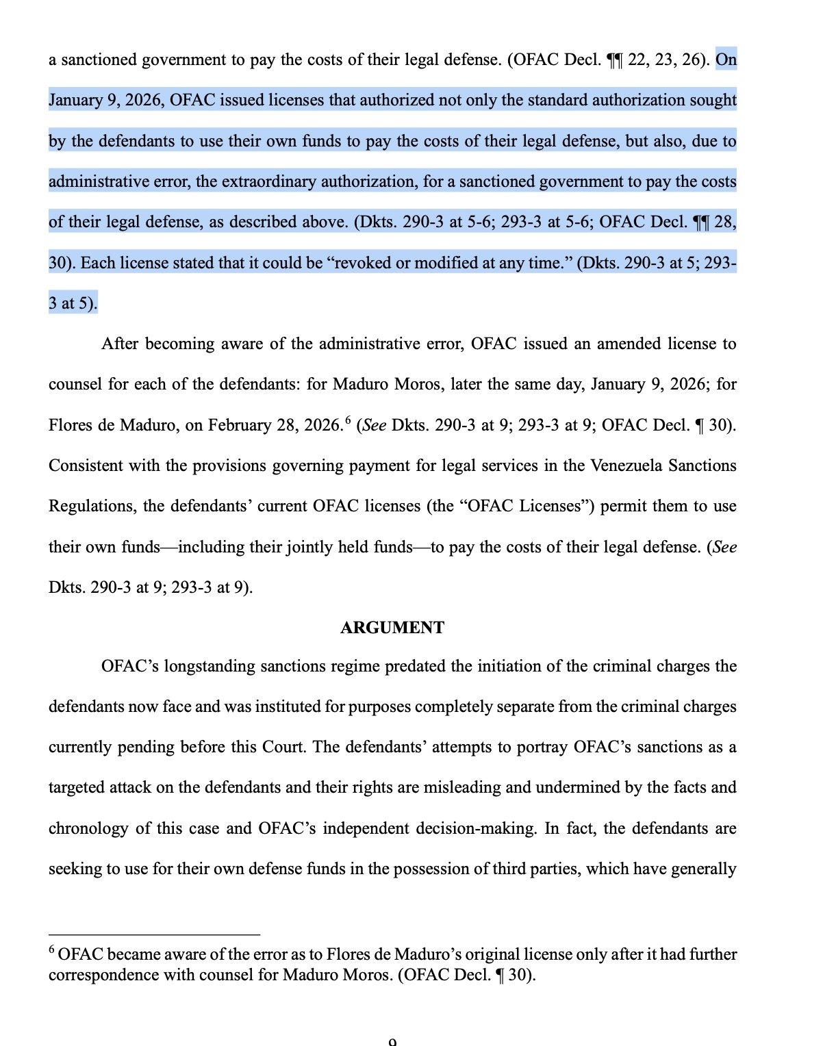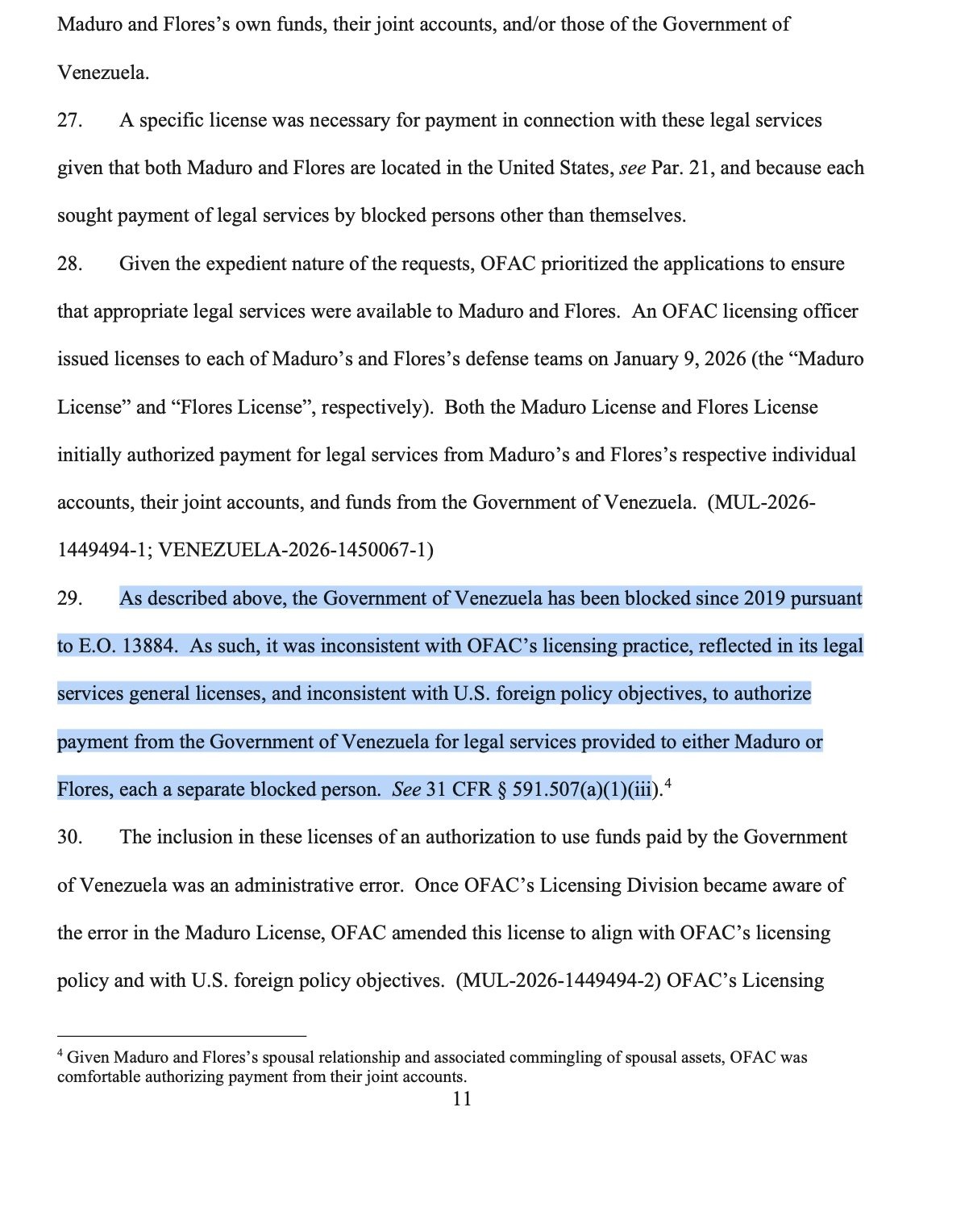 Ante el intento de los abogados de tumbar el caso por esta restricción financiera, la fiscalía neoyorquina respondió de manera contundente y se apegó a la normativa vigente. El memorando detalló que «como se describió anteriormente, el Gobierno de Venezuela ha estado bloqueado desde 2019 en virtud de la Orden Ejecutiva 13884. Como tal, era inconsistente con la práctica de concesión de licencias de la OFAC (…) e inconsistente con los objetivos de política exterior de EEUU, autorizar el pago del Gobierno de Venezuela por servicios legales prestados a Maduro o Flores».
