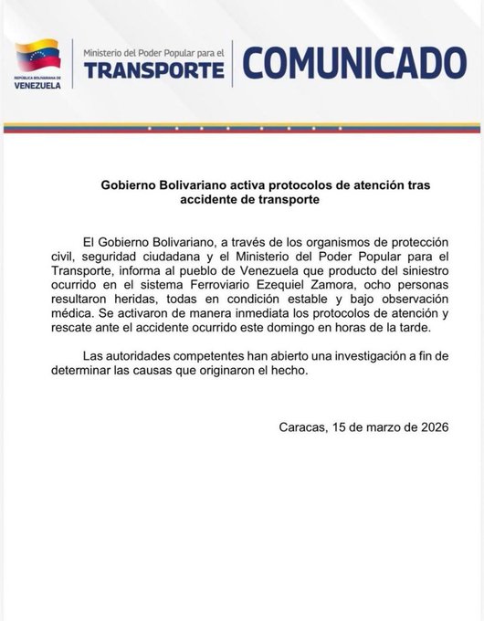 En un comunicado, el Ministerio de Transporte aseguró que los lesionados se encuentran «en condición estable y bajo observación médica».