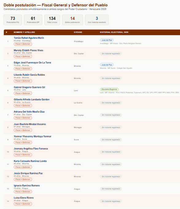 “De la lista de postulados a Fiscal General y Defensor del Pueblo encontramos 14 nombres repetidos. Personas que se postularon indistintamente a ambos cargos (así lo permitió el comité de postulaciones) como si se tratara de cargos con funciones equivalentes”, publicó el especialista en temas electorales en su cuenta en X.