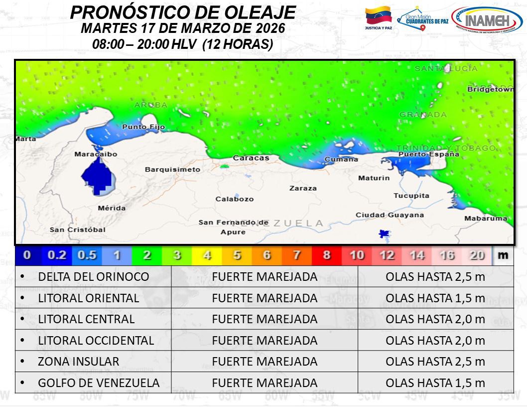 Se estiman olas de hasta 2,5 metros de altura en la Zona Insular y el Delta del Orinoco, mientras que en el Litoral Central y Occidental las olas podrían alcanzar los 2,0 metros. En el Golfo de Venezuela y el Litoral Oriental se prevé un oleaje máximo de 1,5 metros.