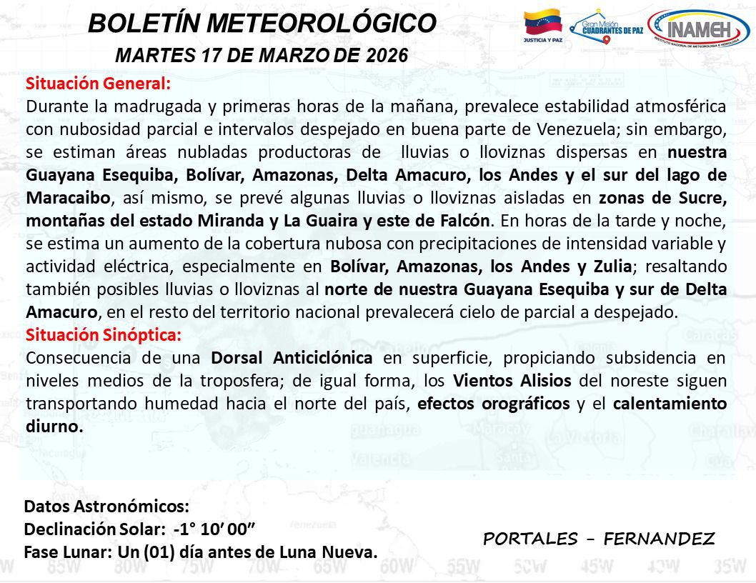 No obstante, se estiman lluvias y lloviznas dispersas en áreas de Bolívar, Amazonas, los Andes y el sur del Lago de Maracaibo. Hacia la tarde y noche, se espera un incremento de la nubosidad con precipitaciones de intensidad variable y actividad eléctrica, especialmente en los estados Zulia, Bolívar, Amazonas y la región andina.