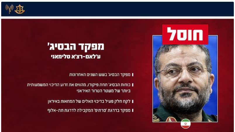 El Ejército de Israel dijo este martes que su fuerza aérea mató esta pasada noche «en un ataque preciso» en Teherán al comandante de la milicia paramilitar iraní Basij (subordinada al Cuerpo de la Guardia Revolucionaria), Gholamreza Soleimani.