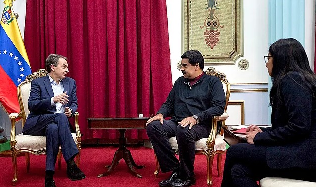 De izquierda a derecha, Zapatero, Maduro y la entonces vicepresidenta Delcy Rodríguez durante una reunión en Caracas Miguel Gutiérrez Efe