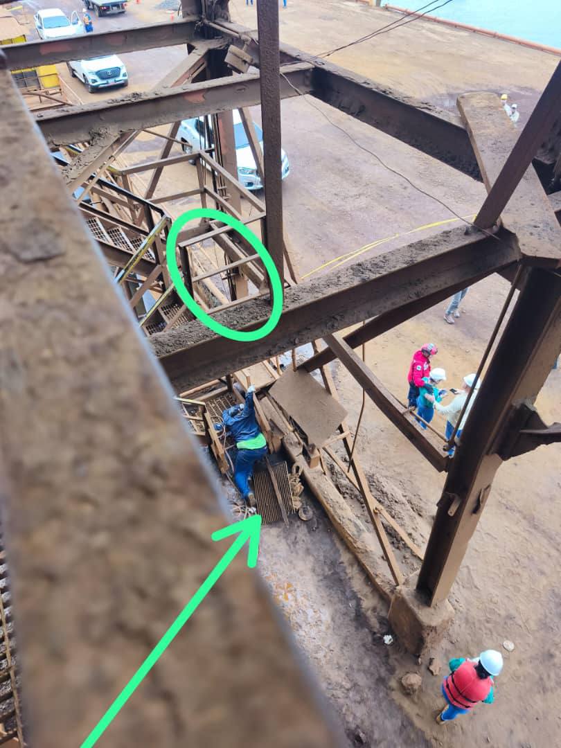 Según reportes preliminares, el siniestro se produjo por el desprendimiento de una escalera metálica en la torre que da acceso a la sala de control de transferencia hacia los buques.