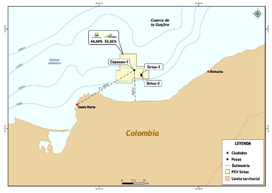 El yacimiento Copoazú-1 «se encuentra a aproximadamente 36 kilómetros de la costa, a una profundidad de agua de 964 metros y a una distancia de más de ocho kilómetros de los pozos Sirius-1 (descubridor de gas) y Sirius-2 (delimitador)», los mayores yacimientos colombianos.