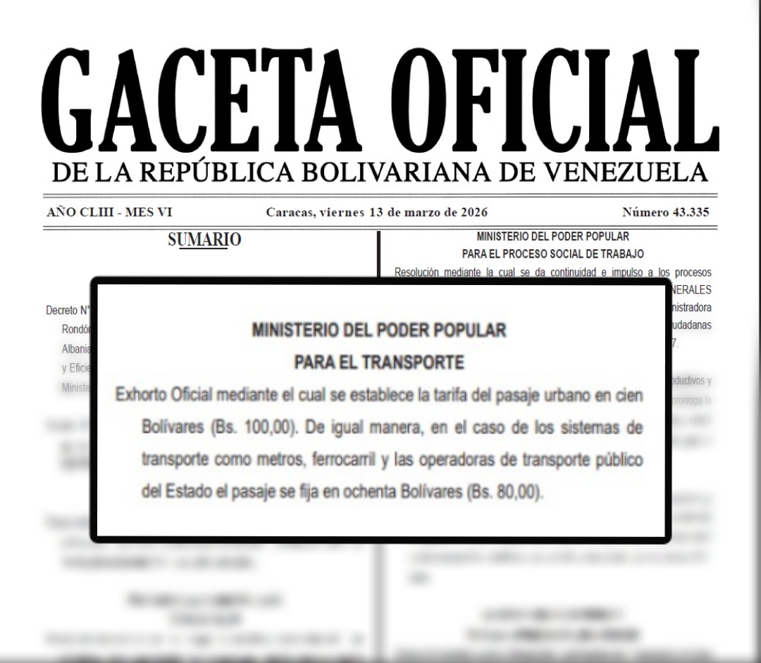 El documento, con fecha del 13 de marzo, establece la tarifa mínima del transporte público urbano en 100 bolívares, en medio de las exigencias del gremio que venía reclamando un ajuste ante el incremento de los costos operativos.