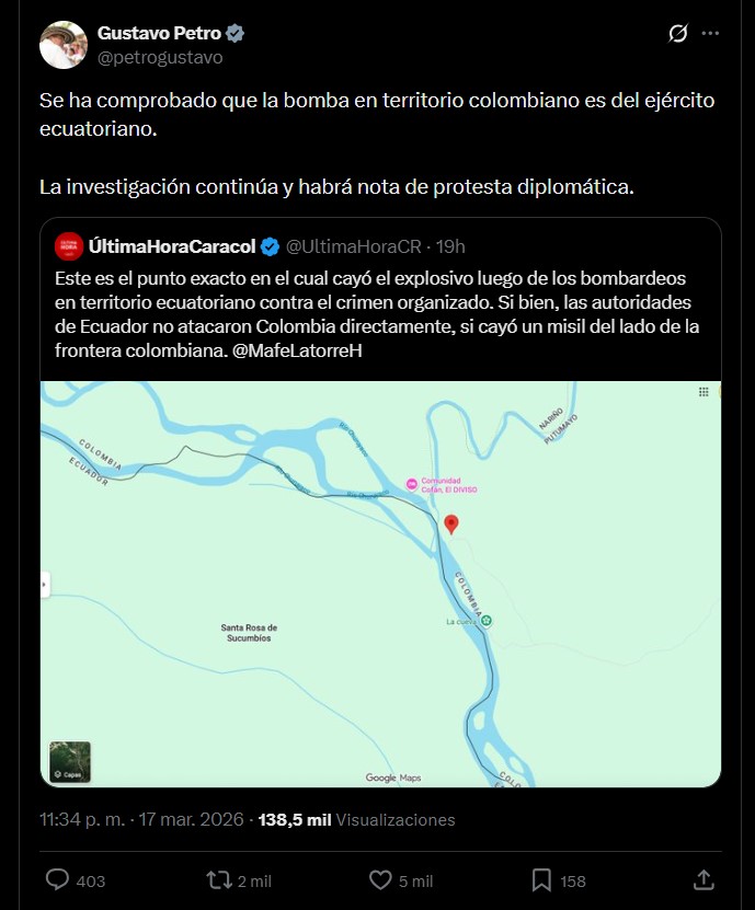 «Se ha comprobado que la bomba en territorio colombiano es del ejército ecuatoriano. La investigación continúa y habrá nota de protesta diplomática», expresó Petro en la red social X.