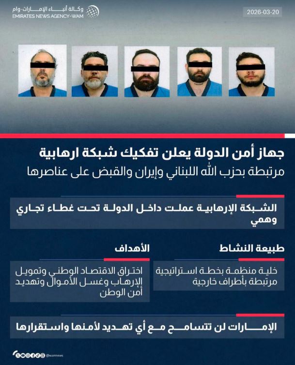 El Aparato de Seguridad del Estado de Emiratos Árabes Unidos (EAU) anunció este jueves 19 de marzo, que desmanteló «una red terrorista» financiada y operada por el grupo chií libanés Hezbolá e Irán, que atentaba contra la seguridad nacional.