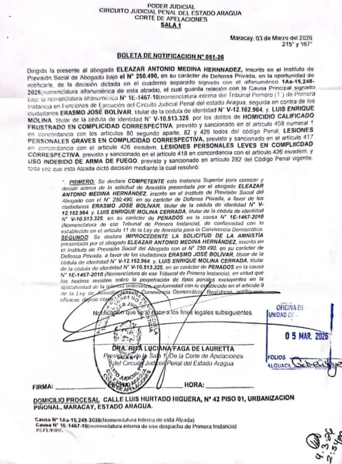 La boleta de notificación firmada por Rita Luciana Faga de Lauretta, presidenta de la Sala 1 de la Corte de Apelaciones del Circuito Judicial Penal del estado Aragua, tiene fecha del pasado jueves 5 de marzo.