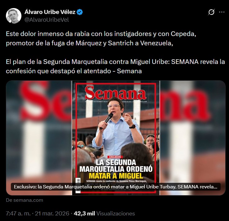 “Este dolor inmenso da rabia con los instigadores y con Cepeda, promotor de la fuga de Márquez y Santrich a Venezuela”, escribió el exjefe de Estado en el mensaje publicado en su cuenta de X, el cual acompañó con la imagen de la portada de la revista SEMANA.